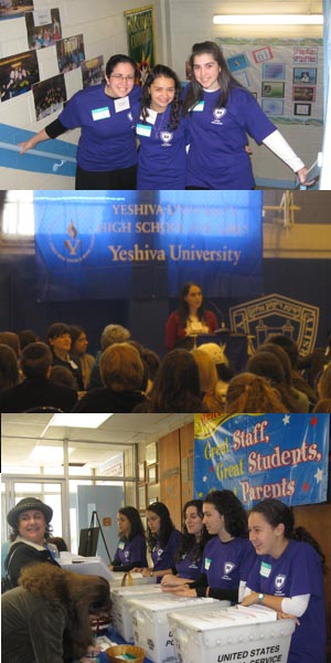 The welcome mat was out on November 8th for the annual YUHSG Open House, where prospective students and their families had the chance to experience our signature hospitality, professionalism and school spirit! With an informative program, enthusiastic student volunteers, erudite teachers and supportive parents, the Open House was an impressive showcase of everything our school has to offer (including an Oscar-worthy performance by the exciting extra-curricular fair “Central Cinema,” produced and directed by Student Activities Coordinator Ms. Shani Hochbaum, with the able assistance of Ms. Miriam Borenstein). Our thanks to Chairman of the High Schools Board Mrs. Miriam Goldberg for her kind words, and to our accomplished alumna Esty Rollhaus (‘06) for the gracious sentiments and reminiscences that were a high point of the morning’s program. Our appreciation, too, to freshmen Adi Shulman and Jennifer Van Amerongen, whose good-humored spirit (and colorful sneakers!) added so much to the proceedings. The warm and welcoming atmosphere generated in the building was due in no small measure to the presence of our many student volunteers, who greeted our visitors, manned the registration desk, introduced our extra- curricular activities and patiently fielded questions. We also gratefully acknowledge the presence of so many members of our parent body (led by Parent Council Chair Mrs. Judy Berman), who shared their enthusiasm for our school with our guests.